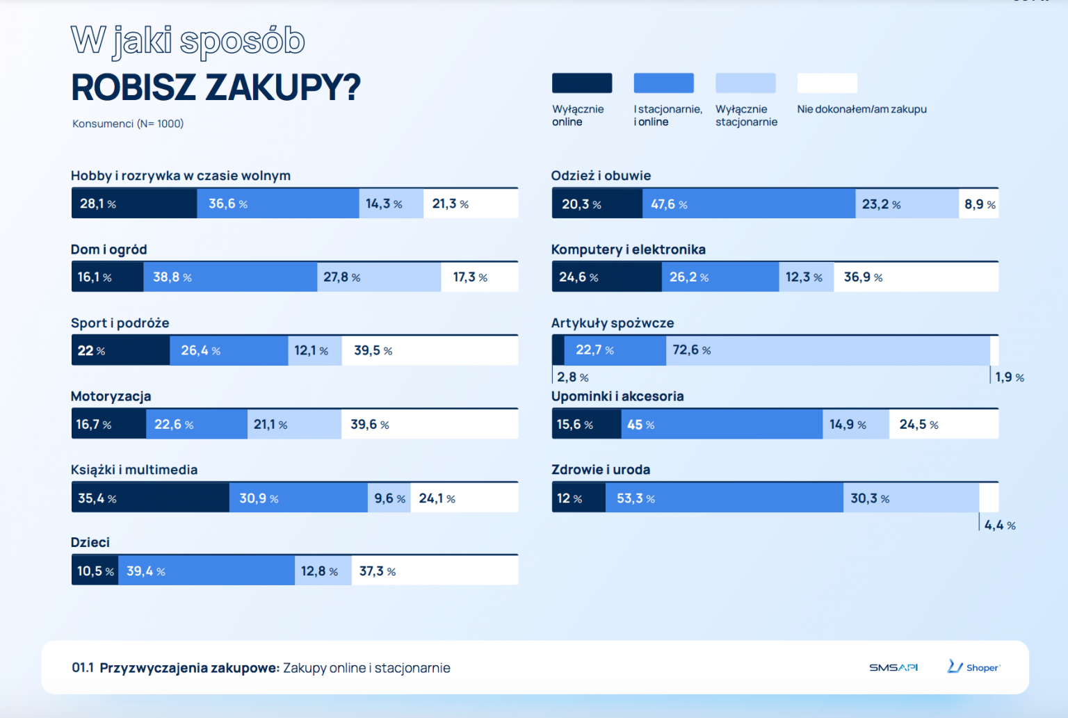 Według badania mężczyźni – w porównaniu do kobiet – wykazują większe zainteresowanie takimi kategoriami produktów jak np. telefony, smartfony, tablety, akcesoria GSM oraz bilety do kina/teatru. Osoby po 50 roku życia częściej kupują produkty farmaceutyczne oraz materiały budowlane i wykończeniowe, natomiast osoby do 24 roku życia – bilety do kina/teatru, odzież, dodatki i akcesoria.