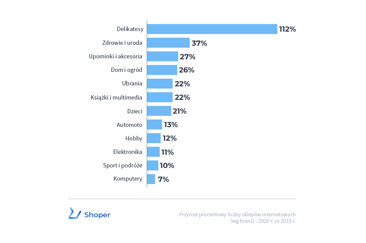 Największy przyrost sklepów internetowych w stosunku do 2019 roku – bo aż o 112% – odnotowaliśmy wśród oferujących produkty spożywcze. O 37% więcej niż w 2019 powstało sklepów z segmentu Zdrowie i uroda.