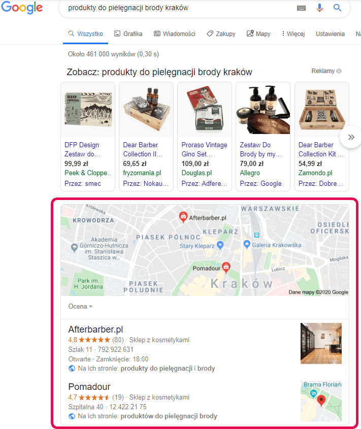 Natomiast wizytówki w mapach Google pokażą się, gdy szukamy bardziej ogólnie, np. „produkty do pielęgnacji brody Kraków”.