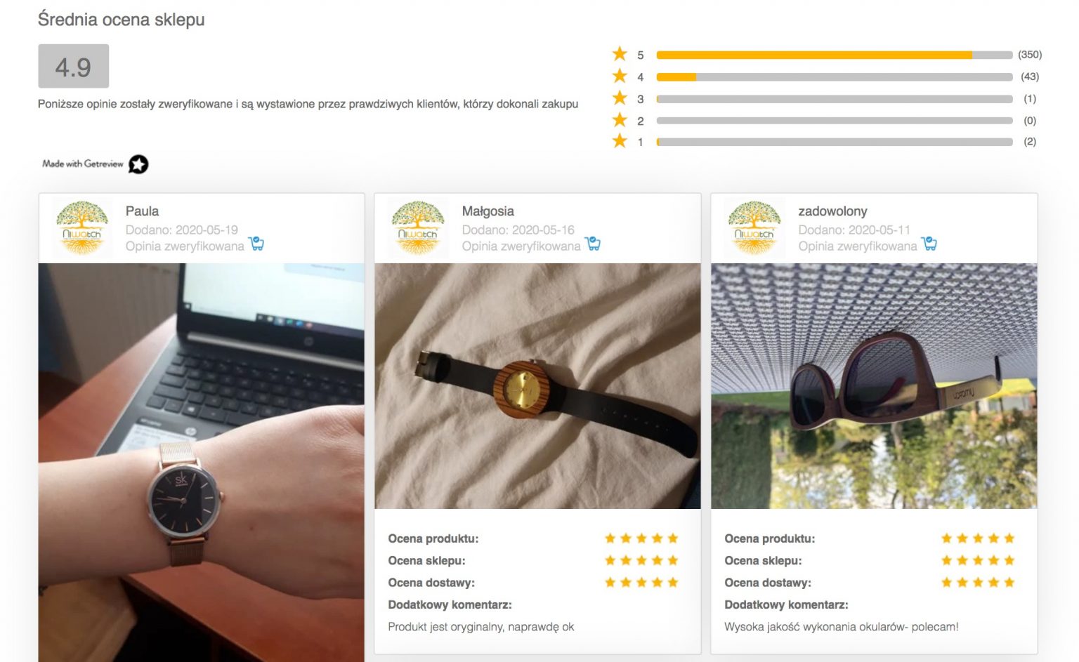 - Nic tak nie buduje wiarygodności marki, jak opinie zadowolonych klientów. Dlatego dobrze sprawdza się umieszczanie na kartach produktów lub w ramach odrębnej zakładki opinii klientów i rekomendacji. Największą zaletą korzystania z opinii klientów, jest ich prawdziwość – użytkownik zakupił, przetestował i wyraził swoje zdanie na temat produktu. Możliwość poznania opinii innych internautów na temat oferowanego przez Ciebie produktu, zadziała na kupującego jak społeczny dowód słuszności, skłaniając go do zakupu. Dzięki jego wypowiedzi Twój sklep zyska na wiarygodności. Opinie klientów są również istotnym elementem biorącym udział w pozycjonowaniu Twojej strony w wyszukiwarce internetowej.