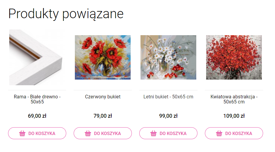 Poniżej przedstawiamy przykład takiego rozwiązania, zastosowany przez sklep pracujący na oprogramowaniu Shoper – Artimento. Podczas oglądania produktu (niech będzie nim obraz do malowania po numerach w rozmiarze 50×65 cm), wyświetlane są inne propozycje z tej kategorii, mogące również zainteresować klienta, różniące się od oglądanego produktu parametrami i ceną.