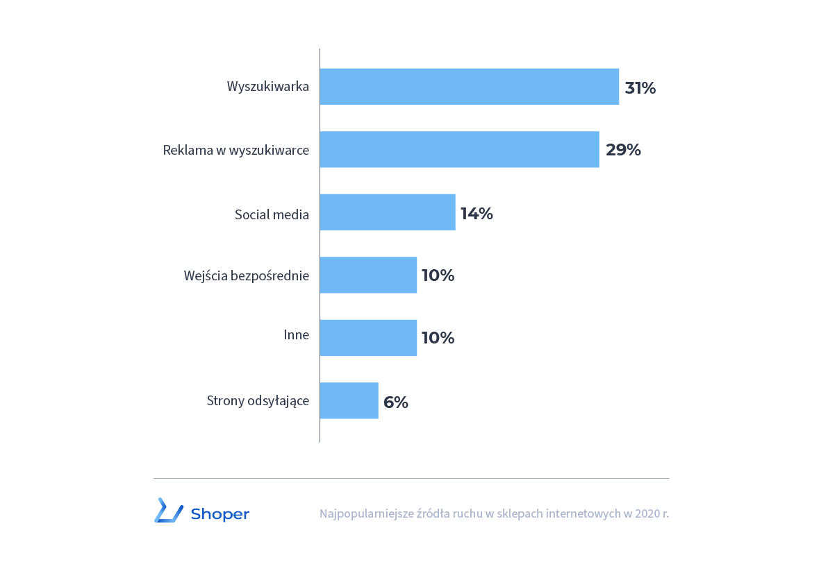 Dane zebrane przez Shoper wskazują, że dominującym źródłem ruchu w sklepach internetowych jest wyszukiwarka Google – przez organiczne wyniki wyszukiwania na zakupy trafia niemal co trzeci użytkownik (31%), a niewiele mniej (29%) przez płatną promocję w wyszukiwarce. Dlatego zwróć uwagę na możliwość płatnych promocji w Google (Google Ads) oraz w mediach społecznościowych (Facebook Ads), które pomagają generować nowe zamówienia.
