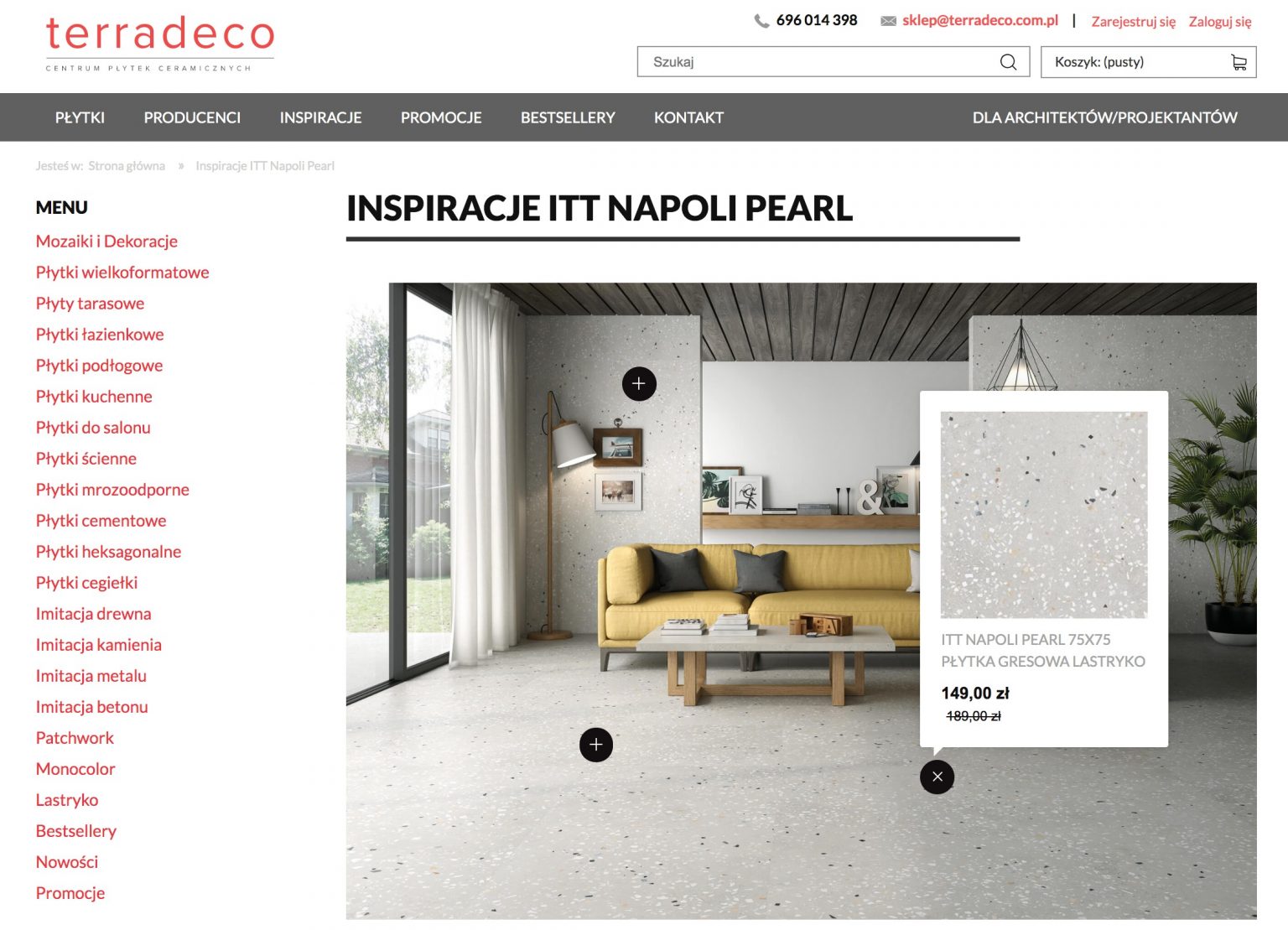 Załóżmy na przykład, że sprzedajesz meble lub artykuły wyposażenie wnętrz. Wykorzystaj więc aplikację, która pozwala na oznaczanie produktów na zdjęciach poglądowych, jak na załączonym obrazku. Po kliknięciu w symbol “+” na zdjęciu, wyświetli się podpowiedź z nazwą produktu oraz ceną. Po jej kliknięciu klient jest przenoszony od razu na kartę produktu, gdzie może dokonać zakupu konkretnego towaru.