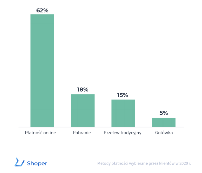 Zgodnie z opublikowanym przez nas raportem o metodach płatności w 2020 roku płatności online zdecydowanie zdominowały opłacanie zamówień w sklepach online. Wśród płatności online największym zainteresowaniem cieszą się te szybkie przy użyciu karty i systemu BLIK.