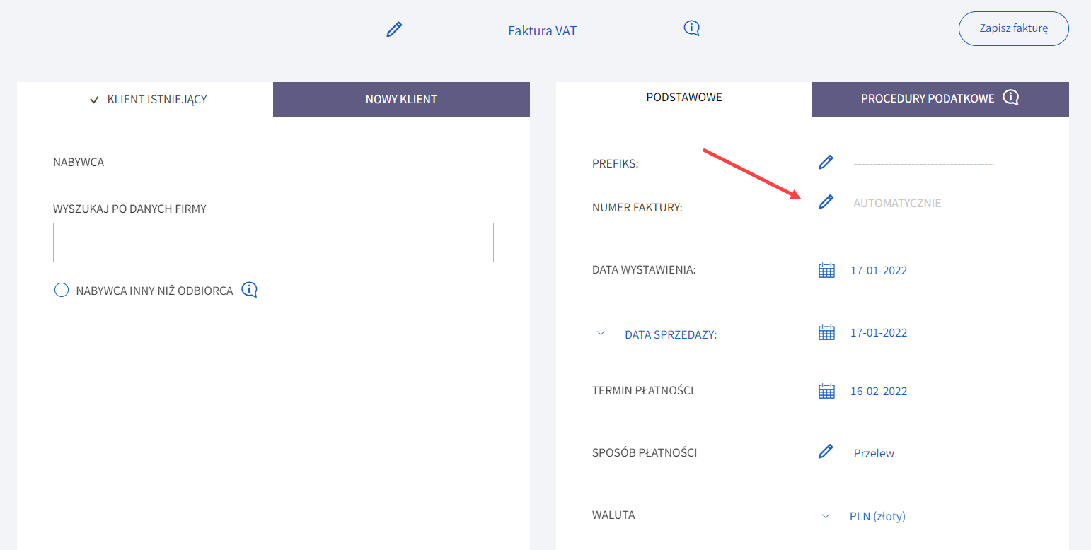 Aby edytować numer faktury należy w polu: NUMER FAKTURY wpisać odpowiednią numerację. Można to zrobić podczas wystawiania nowej faktury, lub edycji już istniejącej.