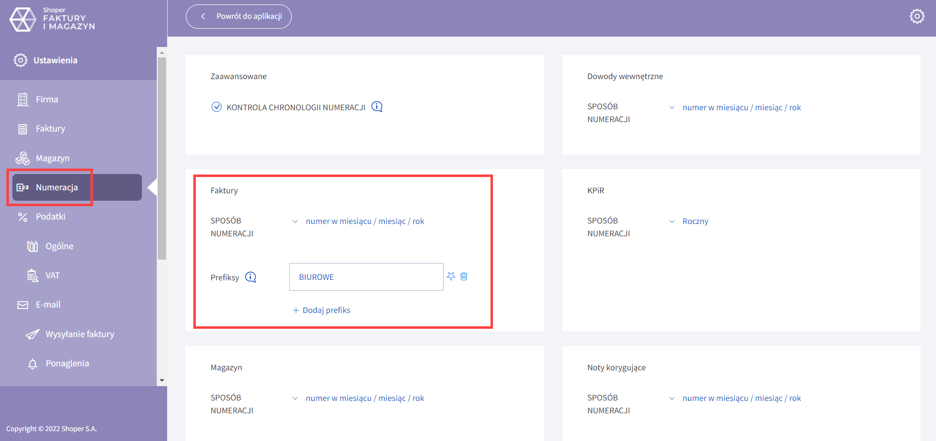 Sposób numeracji oraz prefiks można edytować i konfigurować w zakładce: Ustawienia > Numeracja.
