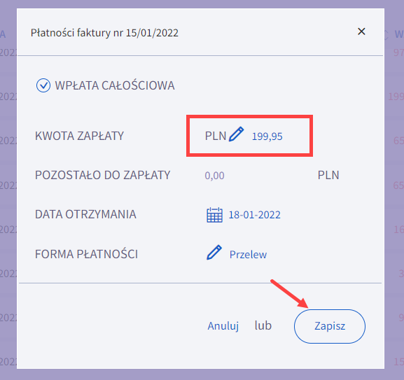 Zmiana kwoty zapłaty wybranej faktury w Shoper Faktury i Magazyn