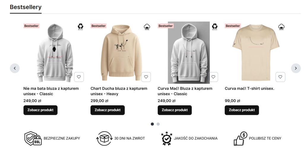 Nowa marka to nie tylko produkcja, ale i pierwsze duże wyzwanie: jak stworzyć sklep, który działa i wygląda dobrze. Justyna miała wątpliwości – przecież nie są informatykami. Jak się za to zabrać? Na szczęście trafili na Shopera i dzięki jego intuicyjnym narzędziom udało się zbudować butik online, który działa, jak dobrze zaprojektowany sklep w galerii. Platforma zadbała o każdy detal. Od edytora Storefront i responsywnego designu, po gotowe regulaminy i polityki prywatności dostępne jednym kliknięciem.
