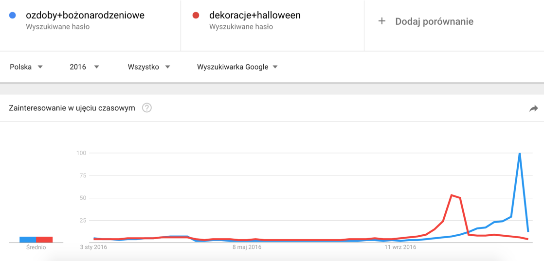 Jeśli koncentrujesz się w swoim sklepie na dekoracjach i ozdobach „świątecznych” – też reklamuj się z wyprzedzeniem. Gadżety na Halloween podsuwaj swoim klientom na długo przed tym świętem, a te pod Boże Narodzenie – najlepiej już od września i października. Na poniższym wykresie wyraźnie widać, że kupujący szukają ich na długo przed pierwszą gwiazdką.