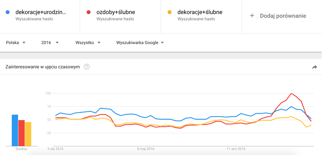 „Dekoracje urodzinowe”, „ozdoby ślubne”… Tu choć liczba zapytań jest w ciągu roku większa, sytuacja wygląda podobnie – od września pojawia się ich w wyszukiwarce Google najwięcej i tak rosną, rosną aż do wiosny. Warto więc więcej zainwestować w działania reklamowe już wtedy.