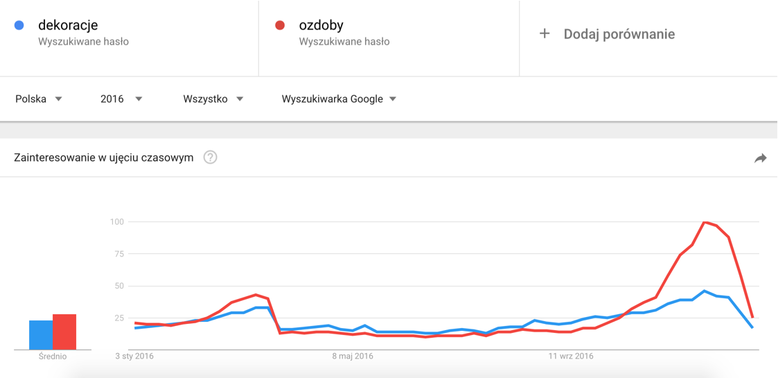 „Dekoracje” i „ozdoby” – jak pokazują dane Google Trends, te frazy są najczęściej wyszukiwane przez użytkowników Google’a wczesną wiosną i późną jesienią oraz zimą. Najrzadziej ludzie szukają ich w sieci od maja do sierpnia. Oferując taki asortyment w swoim sklepie warto ten czas poświęcić na przygotowanie oferty pod końcówkę roku i zacząć reklamować swoje dekoracje i ozdoby już od września, kiedy zainteresowanie nimi wyraźnie wzrasta.