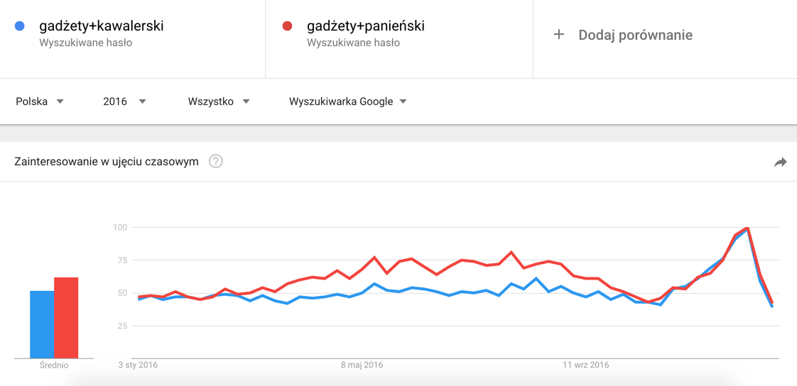 Jeszcze inaczej wygląda kategoria gadżetów i upominków przeznaczonych na wieczory panieńskie i kawalerskie. Te rosną od maja do września, potem notują spadek zainteresowania i na nowo zwyżkują pod koniec roku. I jak widać, panie są w wyszukiwaniu gadżetów zdecydowanie bardziej aktywniejsze od panów.