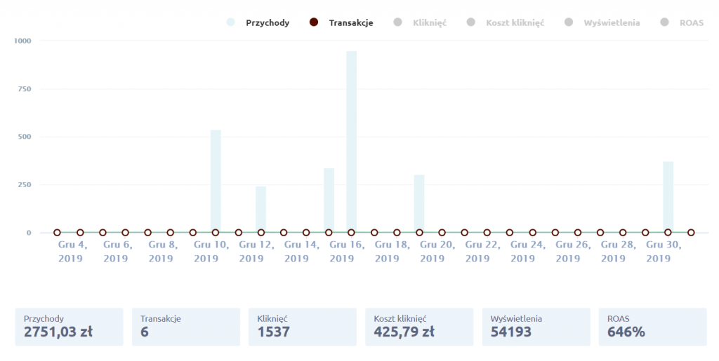 Reklama ruszyła początkiem grudnia, kiedy większość branż notuje wzrost sprzedaży. Mimo to udało się uzyskać tylko 6 konwersji. Ponieważ sklep nie pozyskiwał nowych klientów z innego źródła, kampania ukierunkowana była na pozyskanie ruchu na stronę oraz bazy nowych klientów.
