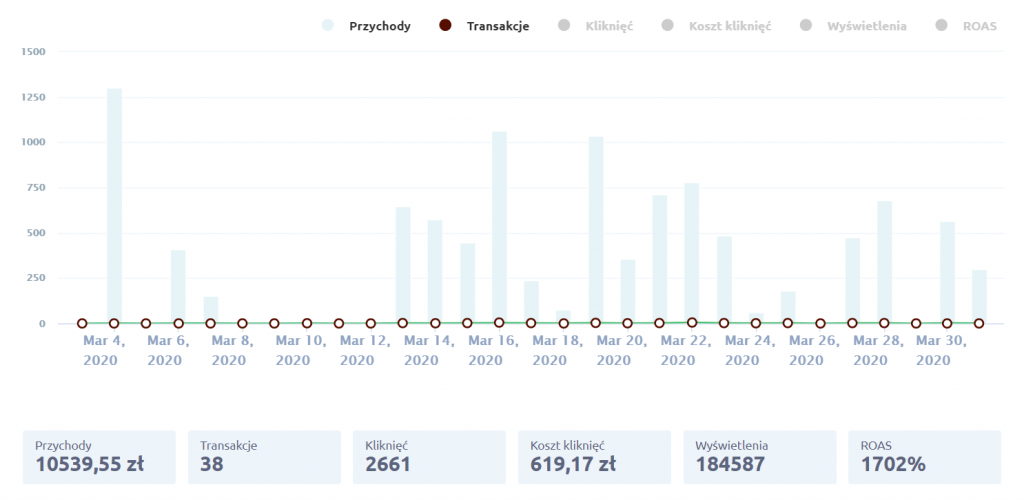 W marcu, czyli w czwartym miesiącu prowadzenia kampanii, zaobserwowaliśmy wyraźny wzrost liczby zamówień. W końcu kampania zaczęła na siebie zarabiać. ROAS (zwrot z inwestycji) osiągnął bardzo dobry wynik, bo aż 1702%.