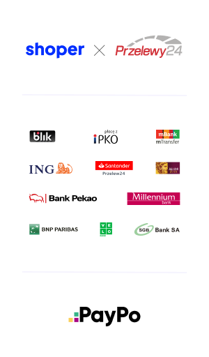 Chcąc korzystać z Shoper Płatności należy spełnić kilka wymogów formalnych. Jednym z nich jest dodanie na stronę sklepu internetowego właściwego baneru z informacją o operatorach płatności online działających w danym sklepie oraz dostępnych kanałach płatności. W artykule znajdziesz banery do pobrania.