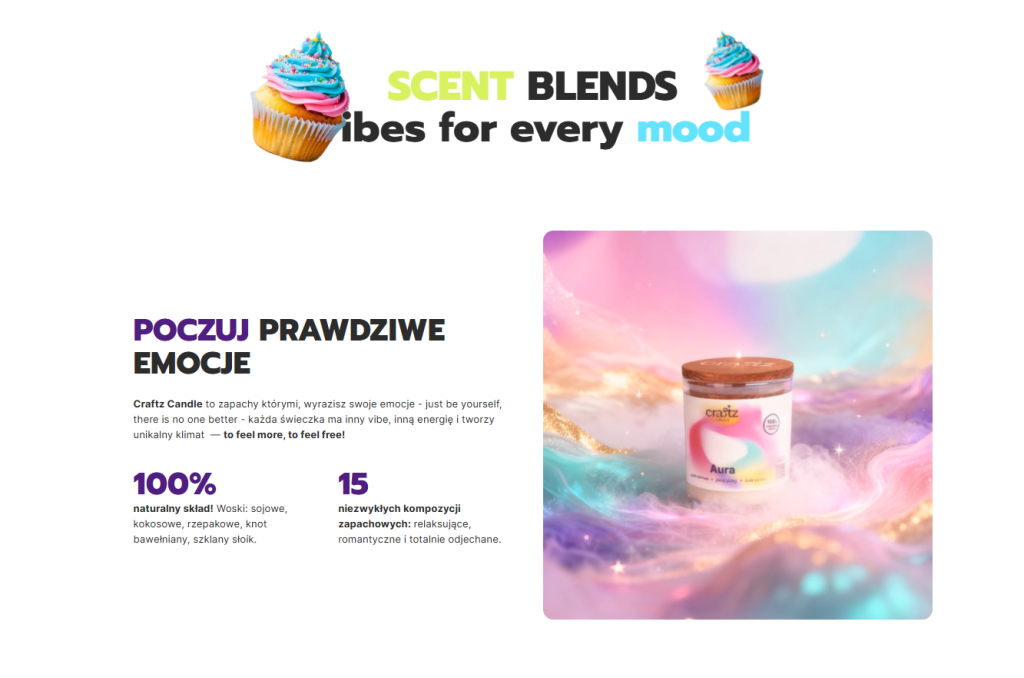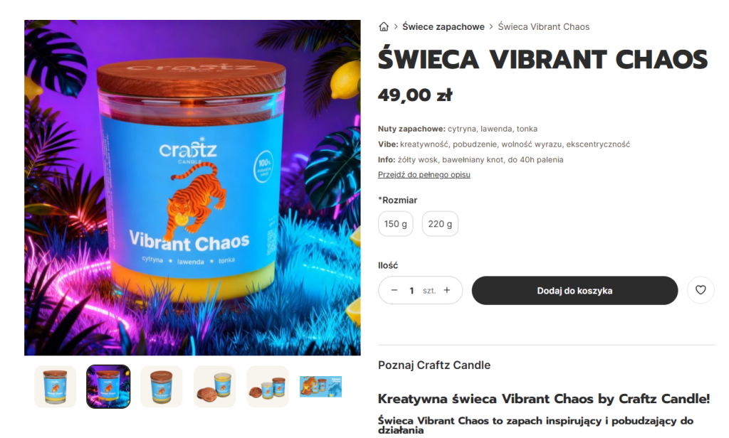 To szablon dopracowany pod względem UX. Proces zakupowy, od karty produktu po koszyk i checkout, jest przejrzysty i szybki. Dzięki temu mogliśmy skupić się na prezentacji marki, nie na poprawkach funkcjonalnych. Craftz Candle to nie zwykłe świece, ale produkty o nieoczywistych i często zaskakujących zapachach. Chcieliśmy, żeby sklep był równie intrygujący jak sama oferta.