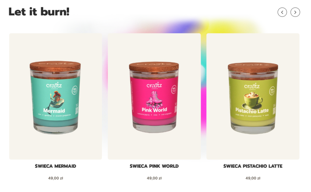Craftz Candle to marka nietuzinkowa, dlatego nie chcieliśmy iść utartą ścieżką. Wykorzystaliśmy moduły szablonu w nieoczywisty sposób, zmieniliśmy charakter kilku sekcji i nadaliśmy im nowy wygląd. Do stworzenia contentu graficznego sięgnęliśmy po AI, przygotowaliśmy teksty, hasła i elementy CTA. Efekt to spójny, nowoczesny sklep z wyraźnym charakterem marki.